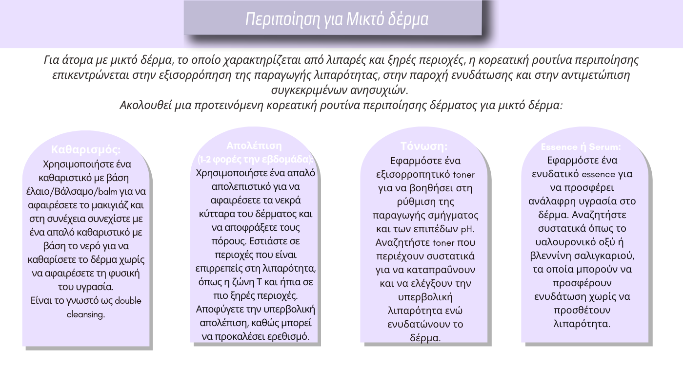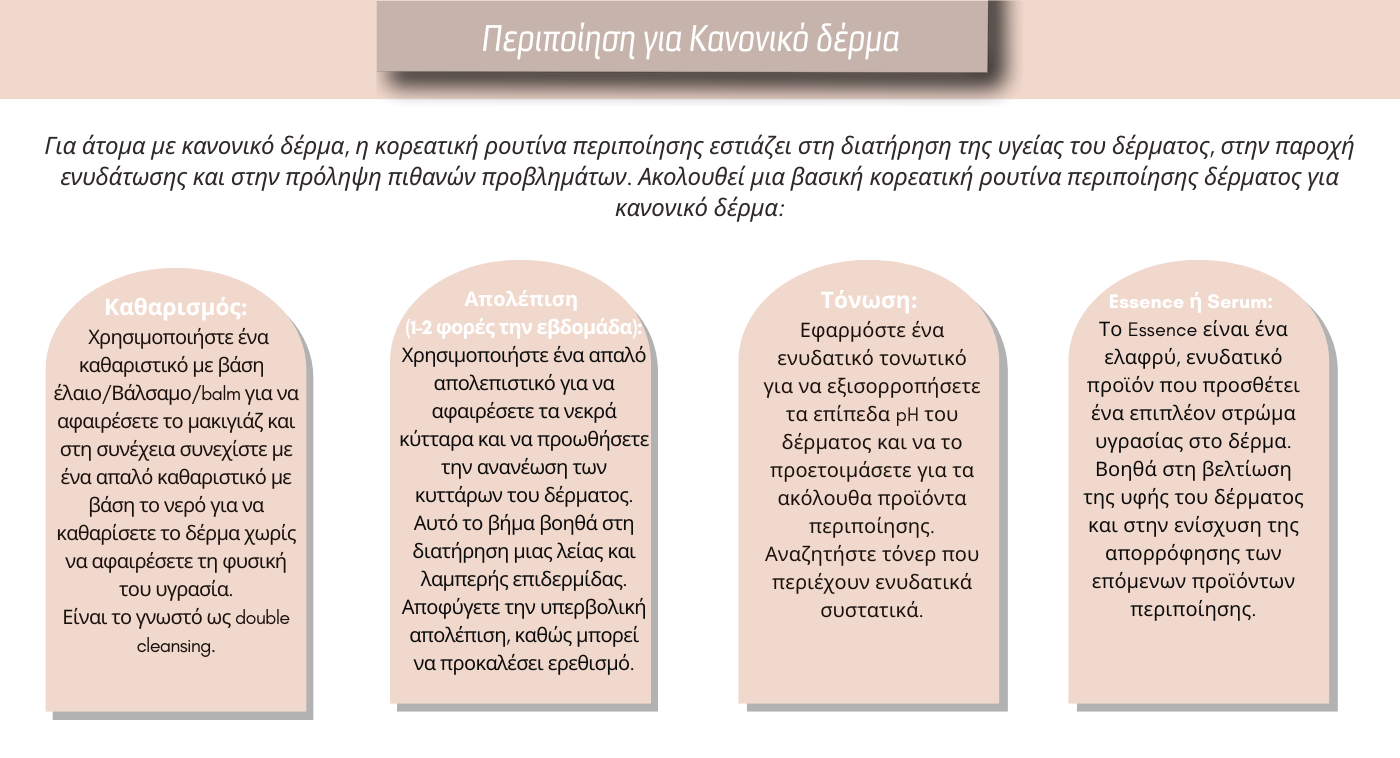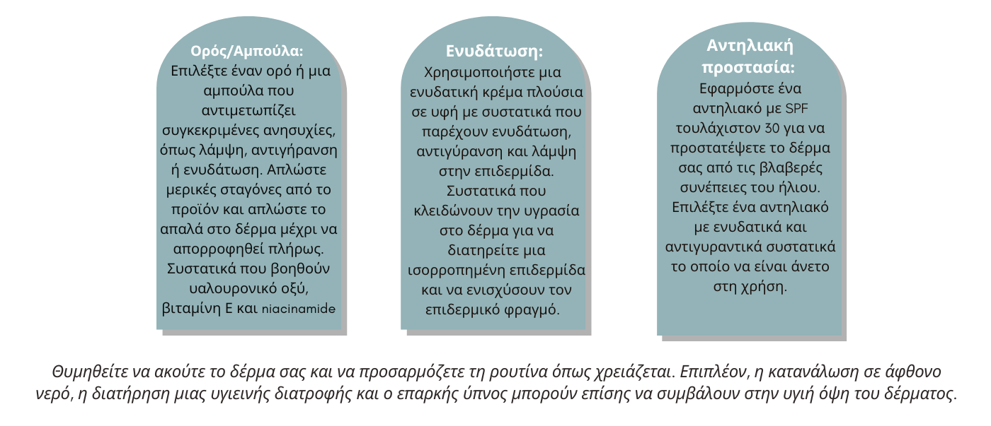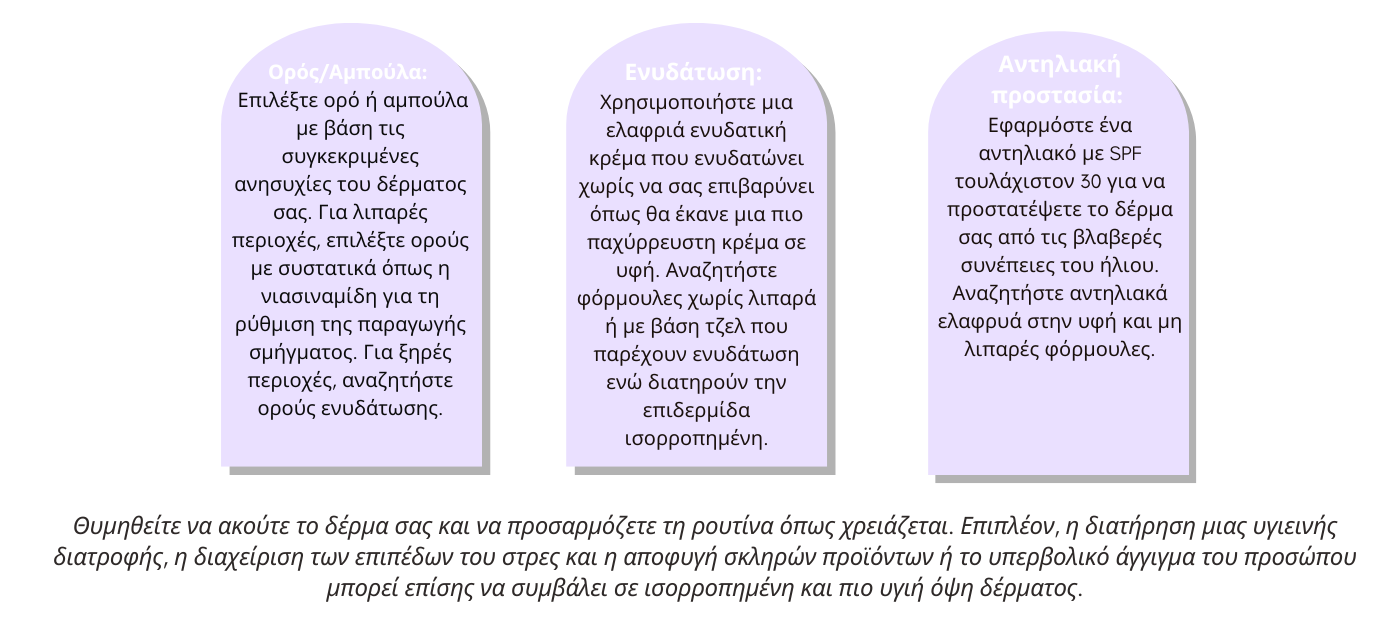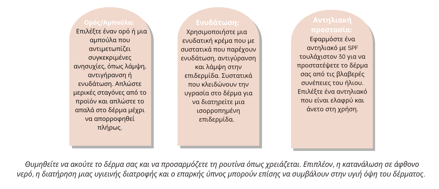 Ανάλογα τον τύπο δέρματος που έχουμε μπορούμε να ακολουθήσουμε τα αντίστοιχα βήματα για να δημιουργήσουμε την καθημερινή ρουτίνα περιποίησης του δέρματος μας για βέλτιστα αποτελέσματα!!